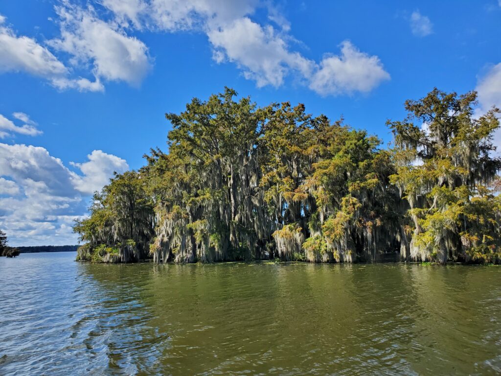 On Saturday, we rented a pontoon boat (and our own captain) from the marina and—armed with a resort-packed lunch and to-go bevvies (and more catfish nuggies) from Cypress Grill—headed out to cruise the lake where we spied trees draped in Spanish moss towering up out of the lake, playing host to great egrets, alligators and other wildlife.