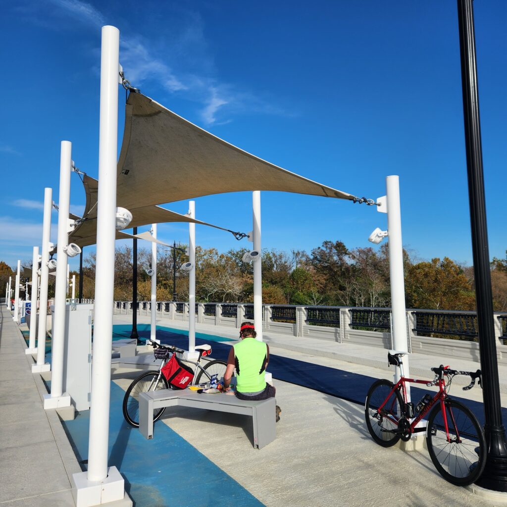 For a breakfast or sunset ride the next day, bike south on the riverwalk and across the Savannah River on the bikes only Freedom Bridge. Both these rides will entice you to snap photos: of fancy homes along the wide Savannah River, the Greenjackets minor league ballpark, an artsy bridge over the river, lilies blooming on the river banks, and those iconic bridges over the canal. Terrain changes from the earthen levee/canal trail, to the brick paved riverwalk, across the colorful paved 5th Street bridge, to the concrete multi use trail along the other side of the river. (Note, that once you cross the river into North Augusta, you are actually in South Carolina as the river serves as the state line.)