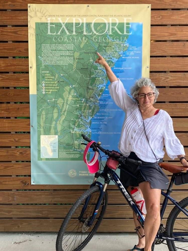 Gravel bikes serve me well if I’m unsure what the terrain will be or i’m simply planning on biking on mixed surfaces. In winter, when we head to the coast, Tybee Island has a sandy road running behind homes that keeps you off the busy main road; Skidaway has nature trails filled with roots and downed leaves; and Whitemarsh switches from boardwalk over marshy areas to natural surface. So my Salsa Journeyer (a gravel bike) is ideal for the adventure. Honestly it just has a relaxed riding posture, flat handle bars, and more tread on the tires, which all work to keep me upright!