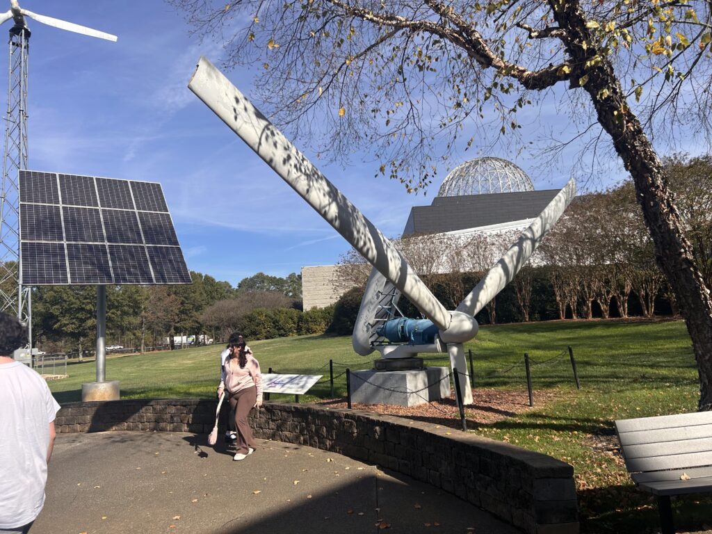 A short drive over, is the Tellus Science Museum, a Smithsonian affiliate and the next stop on our “Museum Day”. As a science and space enthusiast, this was the most anticipated part of the trip for me. Our experience began even before entering the building, with the outdoor Solar House exhibit, which teaches about solar energy. A museum guide shared a story about the wind turbine being struck by lightning recently, pointing out the remnants of the event.