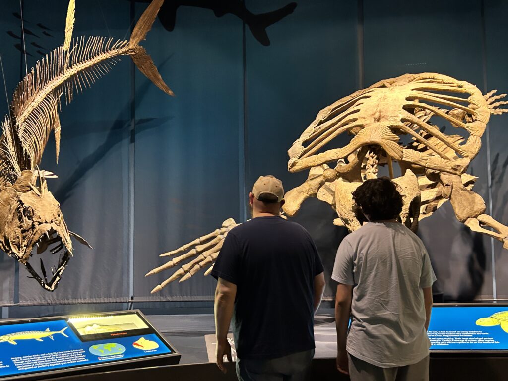 Entering the museum your eyes can’t help but fixate on the massive dinosaur in the Macke Great Hall waiting to greet you. We decided to kick off our visit with the Bentley Planetarium, where we watched the show “Stars.” Experiencing a planetarium show for the first time was incredible—the feeling of being completely surrounded by the wonders of space was unforgettable. The Weinman Mineral Gallery was another hit, showcasing gems, archaeological artifacts, and minerals. Our family had a blast trying out the interactive seismic tool to see who could cause the biggest spike on the screen—never ones to miss a moment for a little competition.